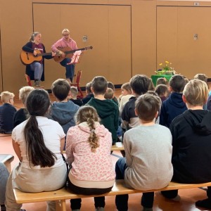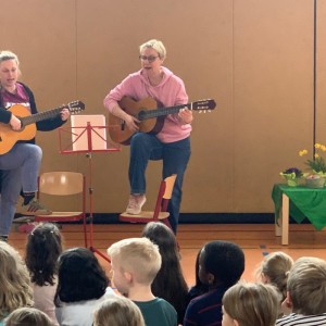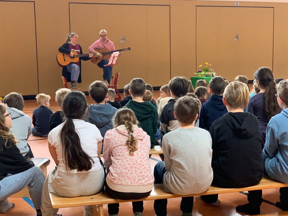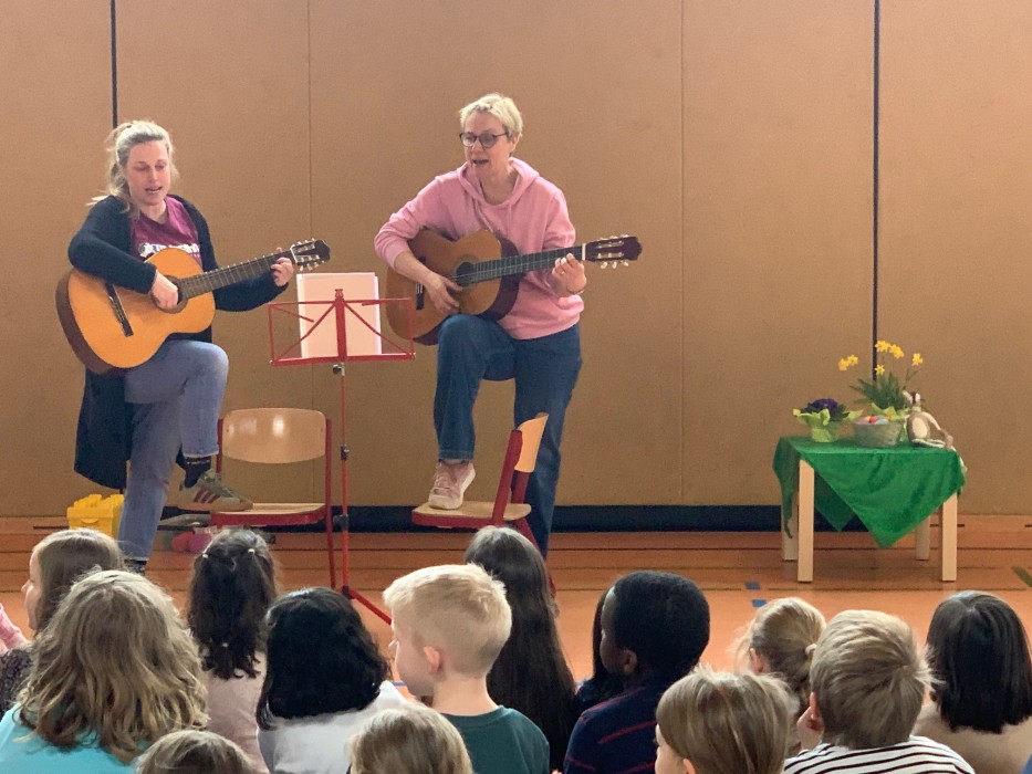 Am letzten Schultag versammelten sich alle Schülerinnen und Schüler mit ihren Lehrkräften in der Kleinen Turnhalle, um den Beginn der warmen Jahreszeit zu feiern. In fröhlicher Atmosphäre wurden bekannte Frühlingslieder gesungen und kleine Programmpunkte von einzelnen Klassen präsentiert. So führten die Klassen 1c, 2b und 2c einen Cupsong zum Lied "Alle Vögel sind schon da" auf, während die Kl. 4c einen schwungvollen Tanz aufführte.