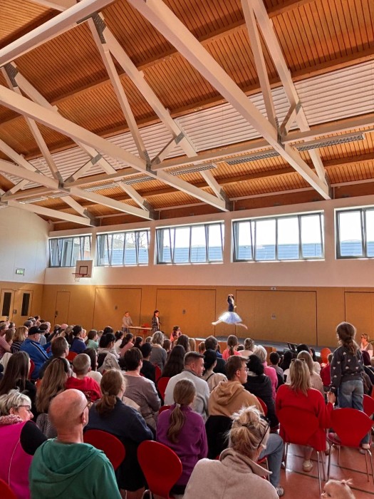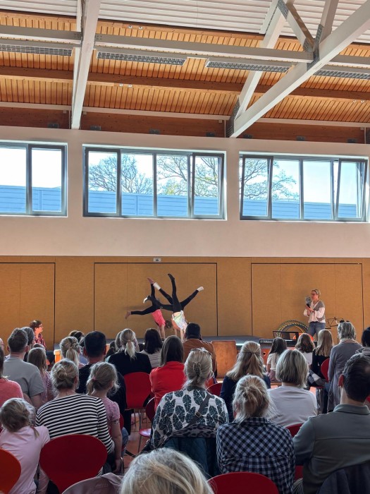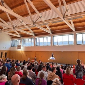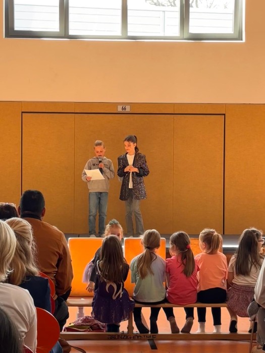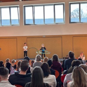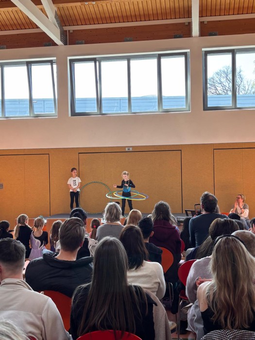Am Donnerstag, den 26.04.2026 hieß es wieder Bühne frei! Jedes Kind bekam die Gelegenheit, seine Talente zu zeigen und so erlebte das Publikum eine abwechslungsreiche Veranstaltung, die von den beiden Schülersprechern moderiert wurde. Ob Akrobatik, Hula Hoop, Klavier- und Flötenspiel, Tanz, Akrobatik, Witze erzählen, Gesang oder Theaterspiel – alles war vertreten. Die Veranstaltung zeigte eindrucksvoll, wie kreativ und engagiert die Kinder ihre Darbietung einstudiert hatten. Am Ende wurden alle Künstler mit großem Applaus belohnt und sicherlich bleibt der Nachmittag allen Beteiligten in guter Erinnerung!