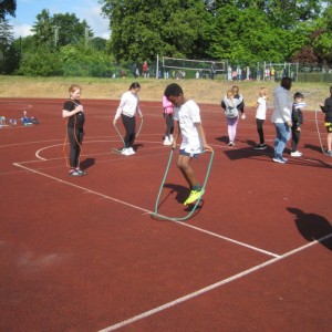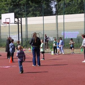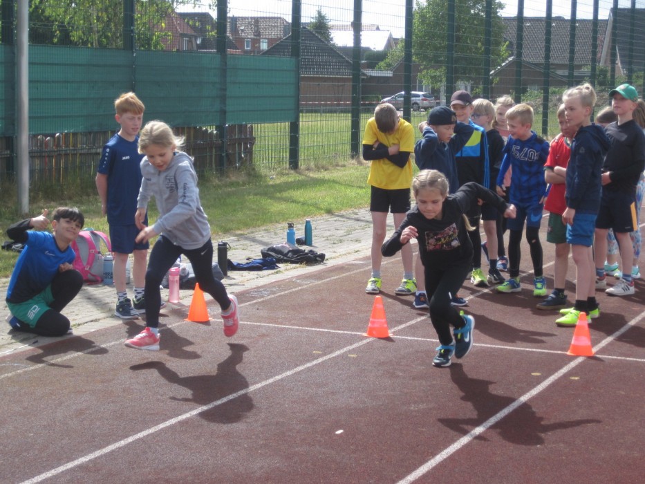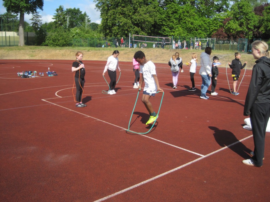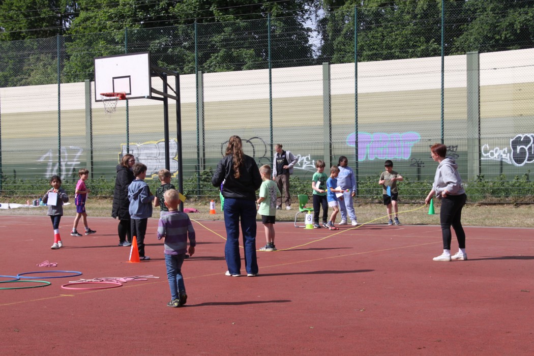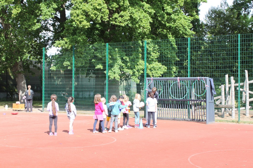 Am 23.05.2025 fand bei uns das jährliche Sport- und Spielefest statt. Die Dritt- und Viertklässler konnten in den Disziplinen 800m-Lauf, Sprint, Zonen-Weitsprung, Werfen und Seilspringen das Deutsche Sportabzeichen ablegen. Bei den Erst- und Zweitklässlern stand dagegen der Spaß mehr im Vordergrund: Sie konnten auf dem roten Platz an unterschiedlichen Sport- und Spielangeboten sportlich aktiv werden.