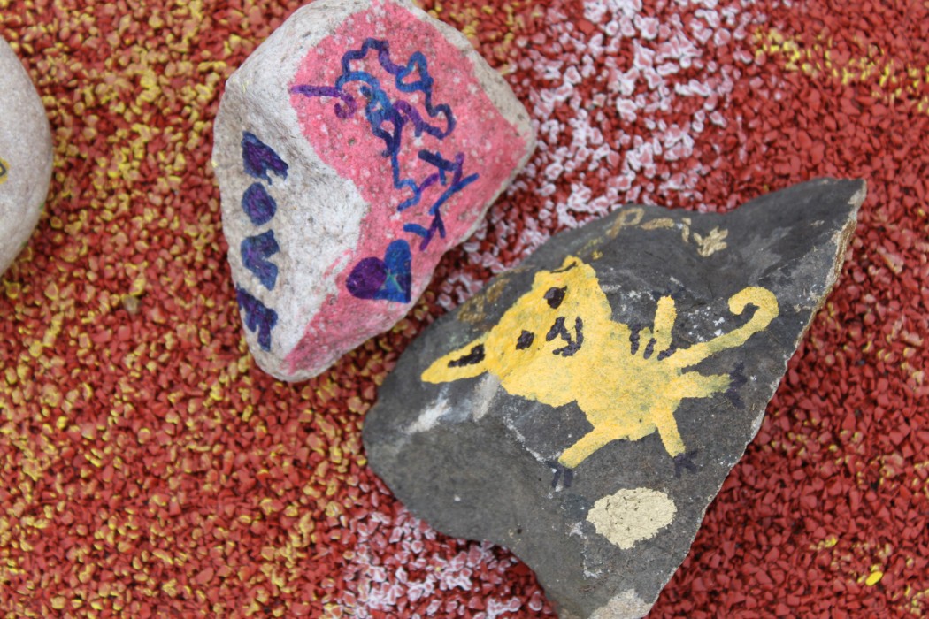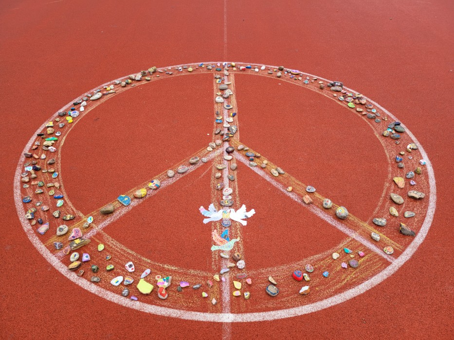 Die Kinder gestalteten im Kunstunterricht "Steine für den Frieden" mit Bildern und Wünschen gegen den Krieg in der Ukraine und für Frieden. Aus den vielen Friedenssteinen entsteht auf dem roten Platz ein großes Peace-Zeichen als Zeichen von Verbundenheit und Solidarität. Die Klassensprecher*innen der 3. Klasse tragen Fürbitten gegen den Krieg in der Ukraine und für Frieden auf der Welt vor. Mit dem gemeinsamen Singen eines Friedensliedes wird die Aktion beendet.
