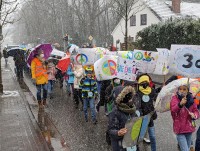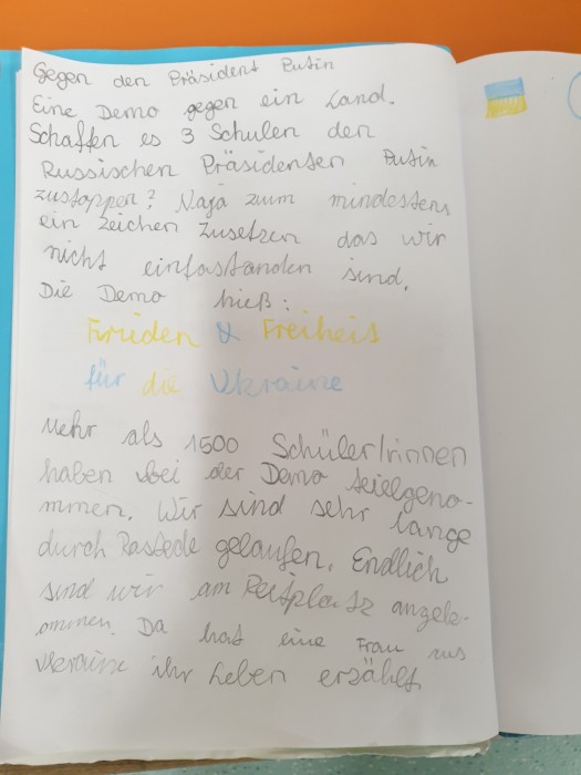 Ca. 1500 Schüler*innen und Lehrer*innen der KGS Rastede und der GS Feldbreite demonstrierten am 31.03.2022 gegen den Krieg in der Ukraine und für Frieden auf der Welt. Der Demonstrationszug zog dabei von beiden Schulen durch den Ort bis zum Turnierplatz; viele Schüler*innen hatten Plakate und Banner gebastelt. Auf dem Turnierplatz sendeten die Schülerinnen und Schüler der AG für den Frieden und die Klassensprecher*innen der vierten Klassen der GS Feldbreite mit ihren Wortbeiträgen klare und bewegende Botschaften für den Frieden.