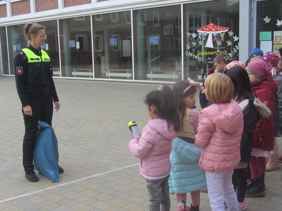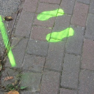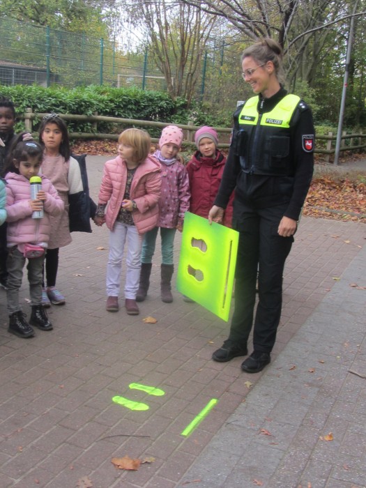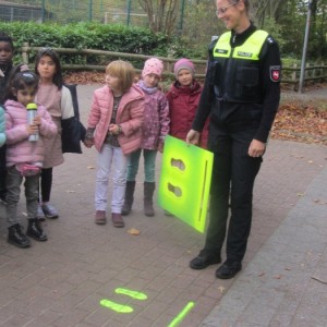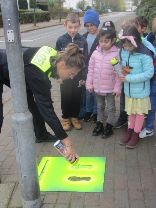 Kurz nach den Herbstferien machten sich die Erstklässler mit Frau Walter, Verkehrssicherheitsberaterin bei der Polizei, auf den Weg, um Gefahrenpunkte im Umfeld der Schule aufzuspüren. An diesen Stellen wurden "Gelbe Füße" als gut sichtbares Zeichen aufgesprüht. Diese warnen die Kinder: "Vorsicht! Hier musst du besonders aufpassen!" Die "Gelben Füße" machen auf Gefahrenpunkte aufmerksam und geben den Kindern an unübersichtlichen Stellen Orientierung.